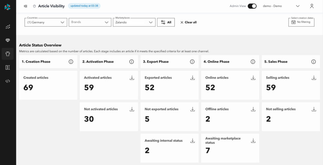 Erhalte täglich einen Überblick über die Sichtbarkeit deiner Produkte über Marktplätze und Kanäle hinweg. Erkenne Aktivierungslücken für bestimmte Kanäle, um Exportprobleme zu lösen, die verhindern, dass deine Produkte Marktplätze erreichen, und analysiere, in welchen Onboarding-Phasen deine Produkte am längsten verbleiben, damit du Bottlenecks beim Go-live beseitigen kannst.